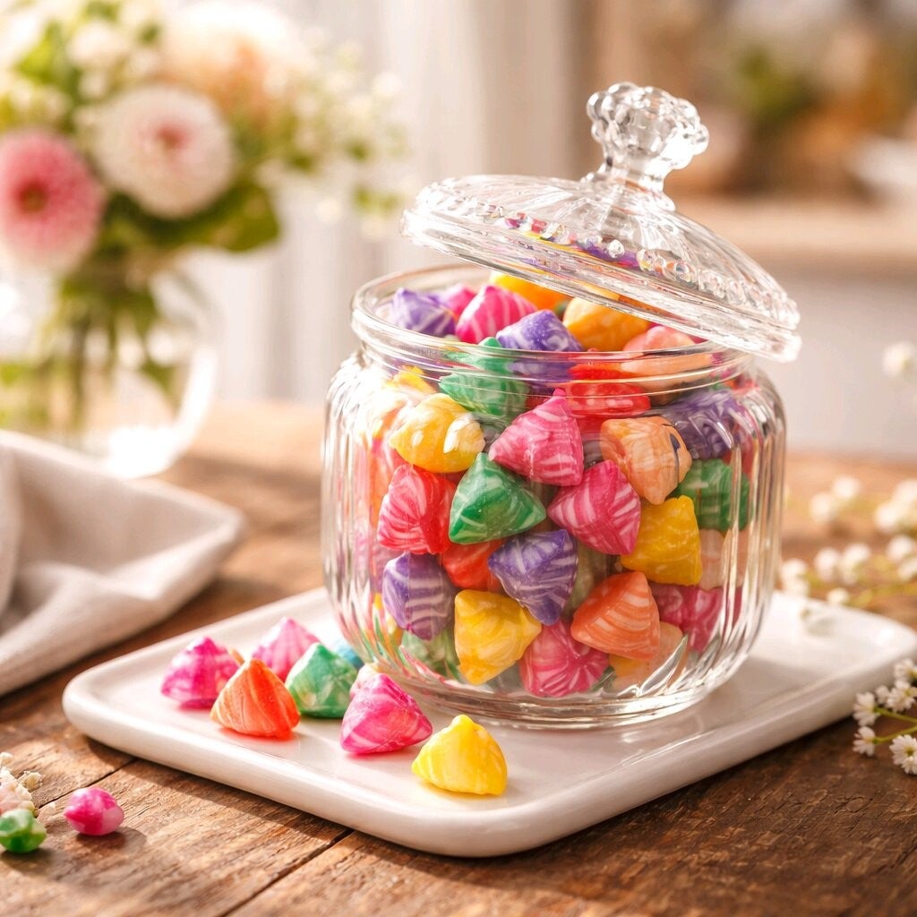 Peuvent être présentés dans une bonbonnière en verre