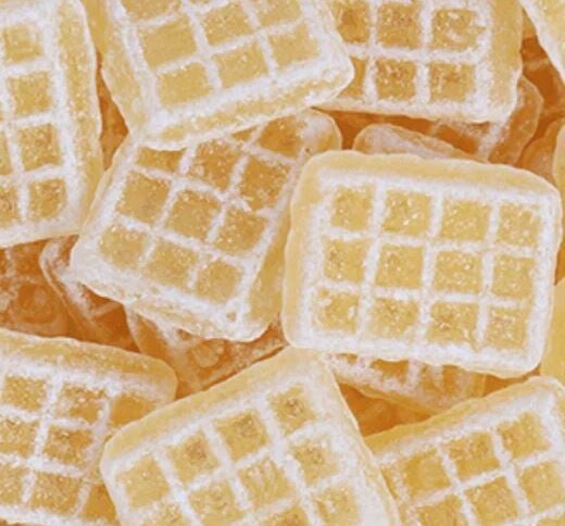 Bonbons dures en forme de mini gaufres au goût doux et délicat de beurre caramélisé.
