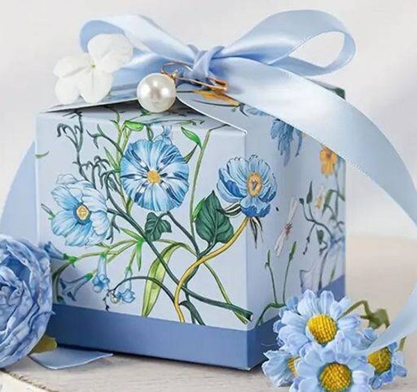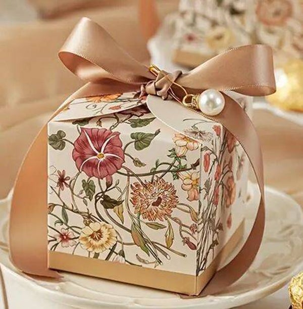 Boite élégante en carton assortie d'une perle et d'un ruban 7x7x7cm par lot de 25