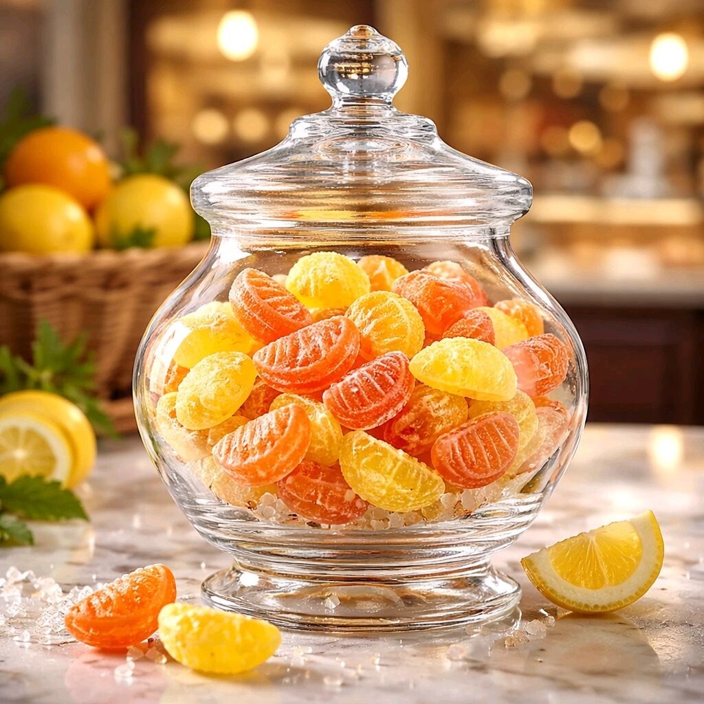 Ingrédients : Sucre, Sirop de glucose, Acide citrique, Huiles essentielles citron, orange, Colorants : curcumine, extrait de paprika
